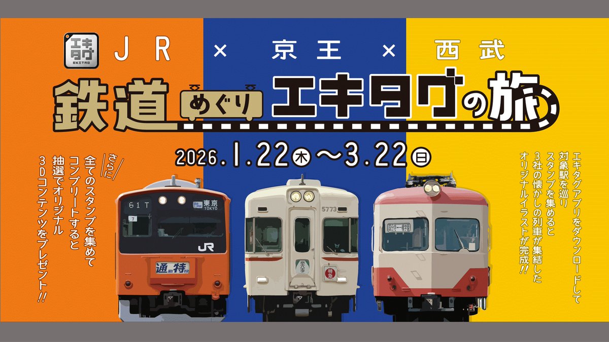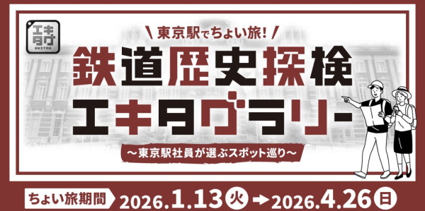 HOME開催中イベント 開催中イベント 開催中イベント一覧 エキタグ、フルカラーになりました!エキタグスタンプラリー 2026年3月14日 「#deremaas@NASU-Ways」エキタグスタンプラリー 2026年3月4日 駅そばの達人 2026 2026年2月19日 JR 花輪線 エキタグスタンプラリー 2026年2月16日 冬のリゾートしらかみに乗ろう!エキタグスタンプラリー 2026年2月14日 スカイマーク× 駅スタンプアプリ「エキタグ」 × 代々木アニメーション学院 「#いば16いろの旅」エキタグスタンプラリー 2026年2月14日 JR東海 身延駅&御殿場駅 鉄道むすめデビュー記念スタンプラリー 2026年2月12日 呪術廻戦×JR東日本 -東日本回游- エキタグスタンプラリー 2026年2月12日 四国のものがたりを紡ぐエキタグスタンプラリー 2026年2月10日 東京駅でちょい旅!鉄道歴史探検エキタグラリー~東京駅社員が選ぶスポット巡り~ 2026年2月9日 ポートライナー延伸線×スカイマーク神戸空港就航 20周年記念デジタルスタンプラリー 2026年2月9日 E131系エキタグスタンプラリー 2026年2月4日 トーマス×JR北海道 おでかけエキタグスタンプラリー 2026年2月4日 JR東日本×京王×西武 3社合同イベント<第4弾>「鉄道めぐりエキタグの旅 」 2026年1月27日 土讃線 高知駅~土佐山田駅間 開通100周年記念デジタル駅スタンプラリー 2026年1月21日 栃木県南・茨城県西を巡る!懐かしの車両エキタグスタンプラリー-JR東日本・真岡鐵道編- 2026年1月21日 ソース×リョーモー エキタグスタンプラリー「ハイカラ散歩」 2026年1月21日